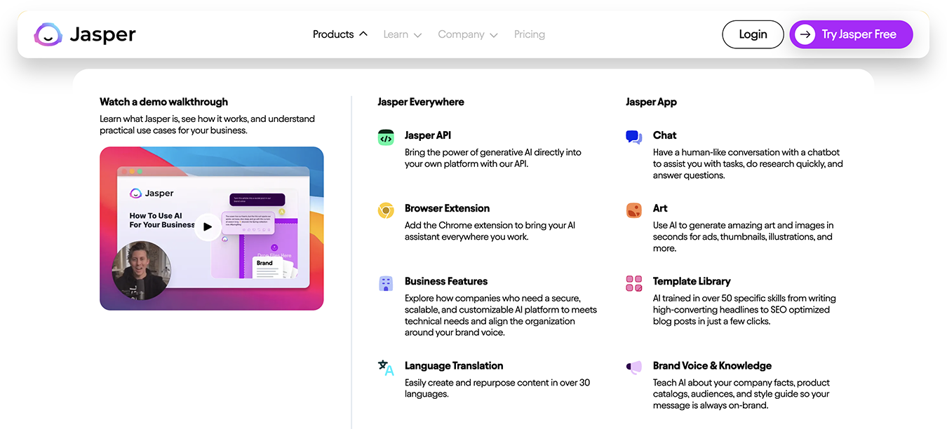Jasper最初发布时叫做Conversion AI,后来又经历了两次改名,最终在2022年更名为现在的Jasper。它的AI引擎结合了多个大型语言模型,例如GPT-4,旨在提供最高质量的输出和最优的稳定性。Jasper能够理解并流利使用多种语言,包括英语、中文、日语、西班牙语、法语或德语。