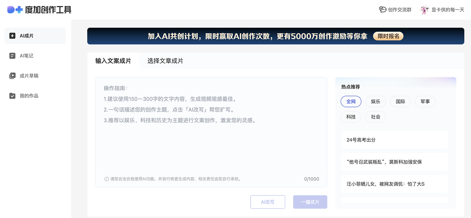 度加创作工具是一个百度出品的、人人可用的AIGC创作平台。度加致力于通过AI能力降低内容生成门槛,提升创作效率,一站式聚合百度AIGC能力,引领跨时代的内容生产方式。度加的主要功能包括AI成片(图文成片/文字成片)、AI笔记(智能图文生成)、AI数字人等。