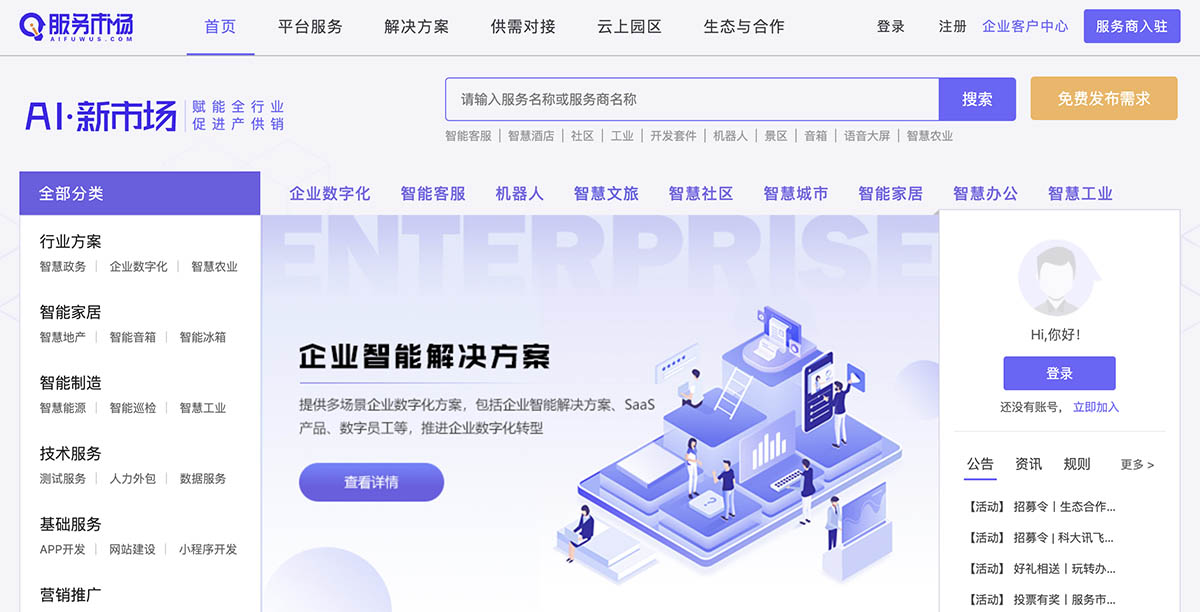 讯飞AI服务市场为服务商提供持续的商机及全方位的赋能,同时也为想要进行智能化转型升级的企业提供全面的产品、解决方案。 基于科大讯飞人工智能技术,整合AI产业上下游链路,拥有众多优质服务商。致力于帮助各企业甄选优秀AI方案,实现一站式智能化升级。